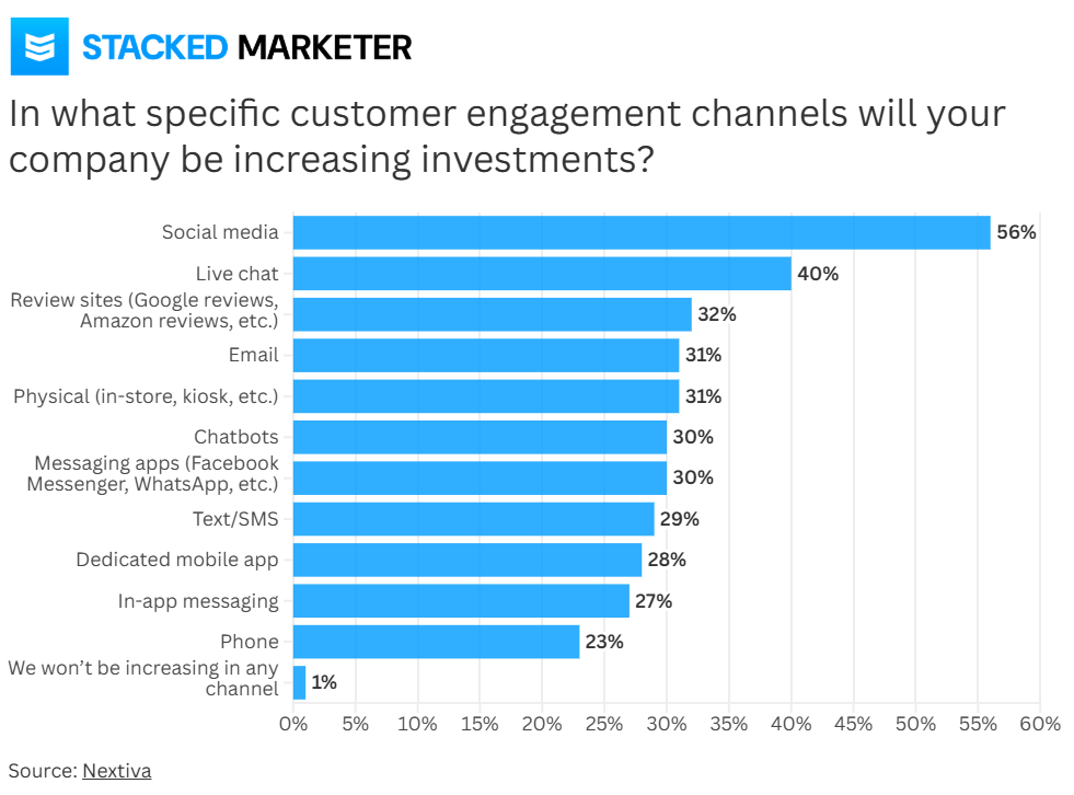 1️⃣ Social Media Leads the Investment: More than half of businesses, 56 percent, plan to increase their spending on customer engagement across social platforms. No other channel comes close. This shows brands now recognize the influence of social proof, public interaction, and real-time visibility.