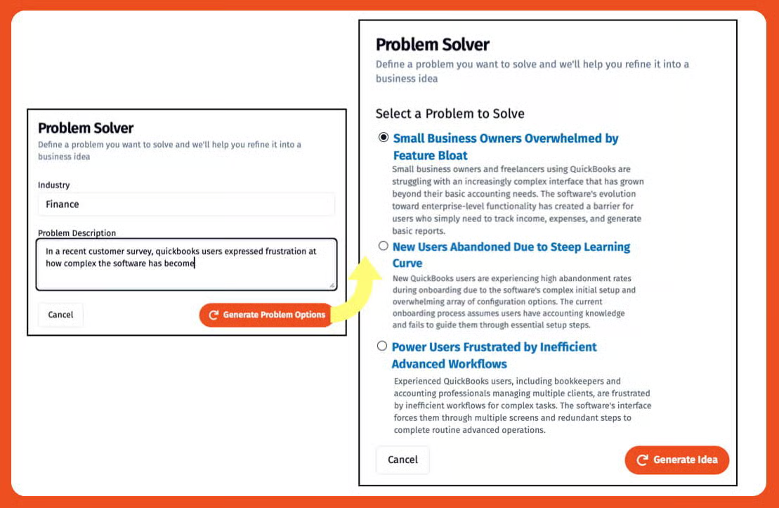 2️⃣ Enter the Problem: Provide your industry and a short problem statement to guide the AI. For example: “You are a QuickBooks competitor with the following insight from user research. Industry: Finance. Problem: QuickBooks users report the software is too complex for their needs.”
