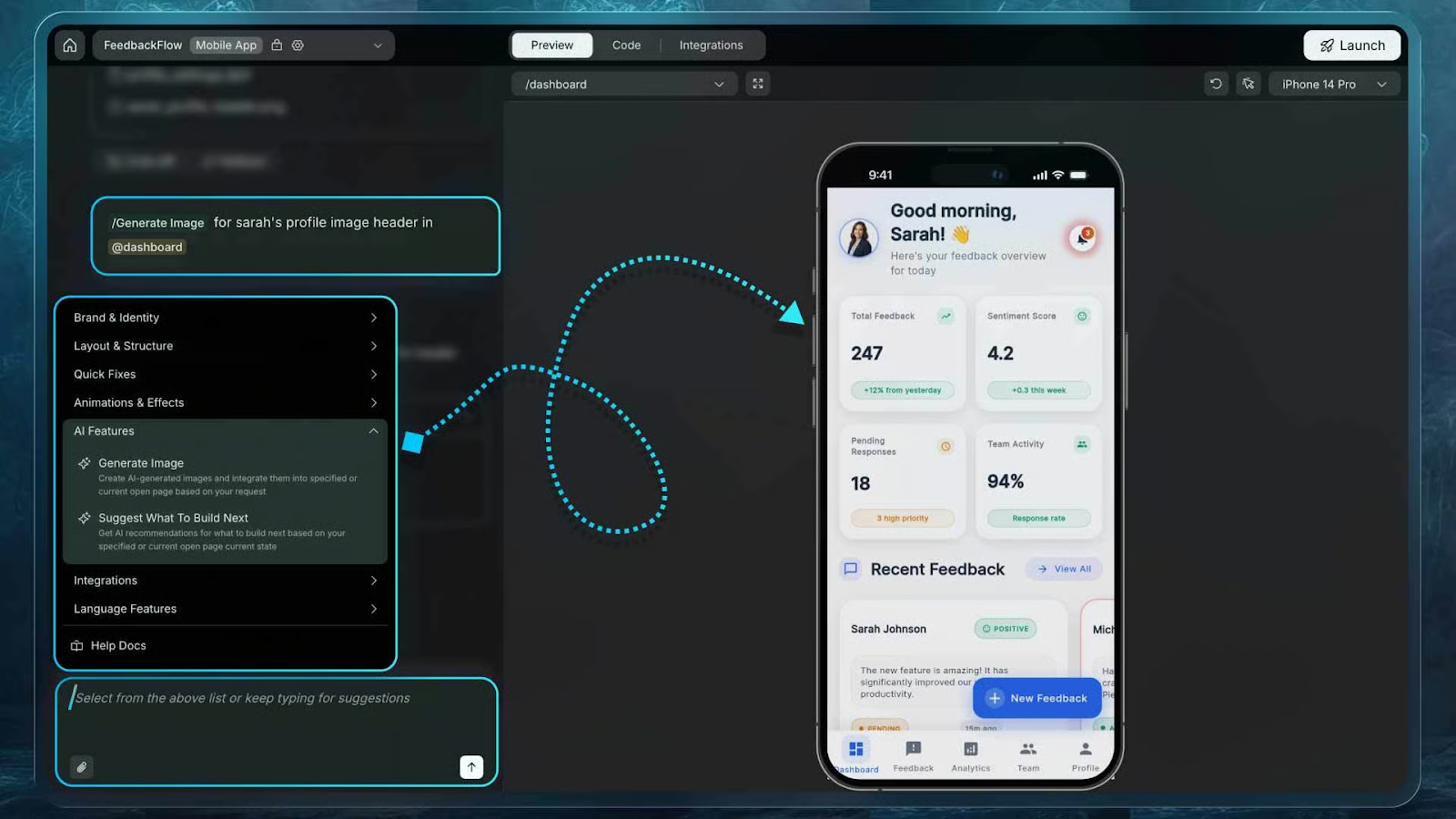 2️⃣ Open the App Preview and Start Editing: Select any screen and open the chat panel. This is where you control the entire build. Type / to access more than 100 structured Rocket Commands that let you change content, add features, or redesign layouts.