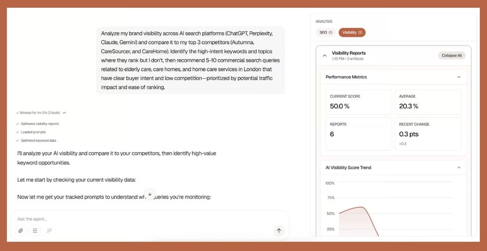 5️⃣ Ask the Agent for New Opportunities: Once your data and competitors are connected, ask for actionable next steps. Example prompt: “Analyze my Google Search Console, analytics, and competitors. Tell me what additional prompts and topics I should target to appear for.”