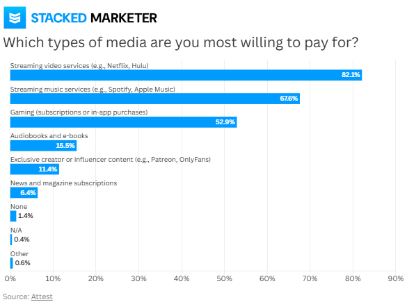 1️⃣ Zoomers Love Streaming: Recent data shows that 82% of Gen Z actively use streaming video services, while 67.6% use music platforms. Even as other generations scale back, Zoomers are driving the momentum, making streaming one of the best ways to reach them consistently.