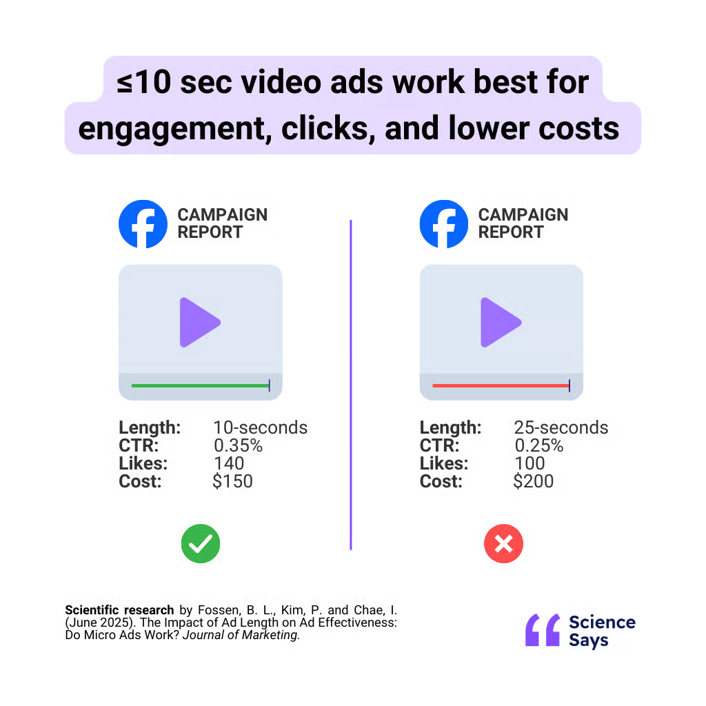 Ten seconds is the new sweet spot. Short, fast, and brand-forward videos not only reduce costs but also triple engagement and drive more traffic, without sacrificing impact. If your ads run longer, you’re likely paying more for less attention.