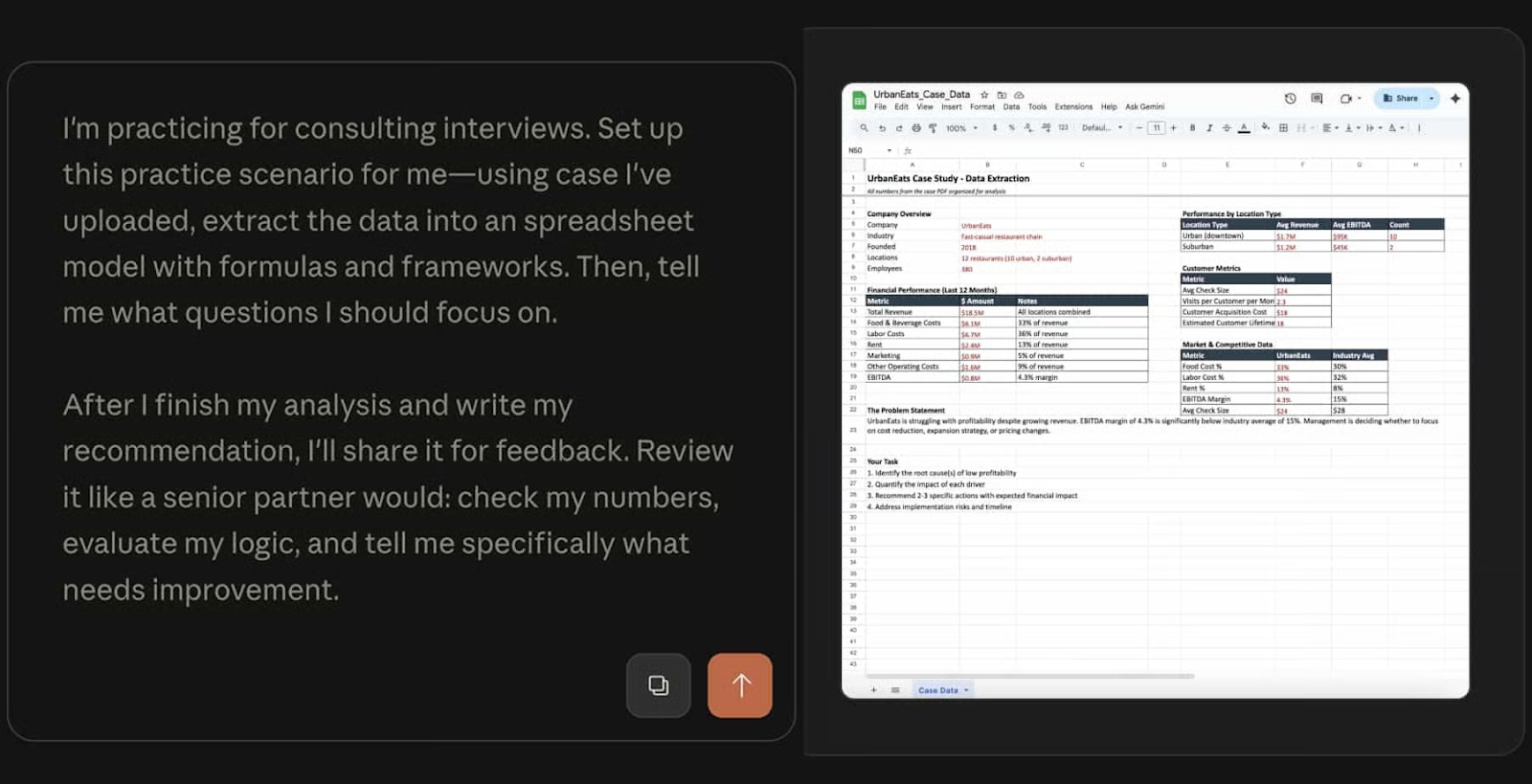 2️⃣ Set Your Goal and Build the Model: Tell Claude exactly what you want to practice and ask it to construct a spreadsheet-style model with formulas and core frameworks. Sample Prompt: “I’m preparing for consulting interviews. Using the case I uploaded, extract the data into a spreadsheet model with formulas and frameworks. Then tell me the key questions to focus on. After I write my recommendation, I’ll share it for feedback. Review it like a senior partner: check my numbers, evaluate my logic, and explain what needs improvement.”