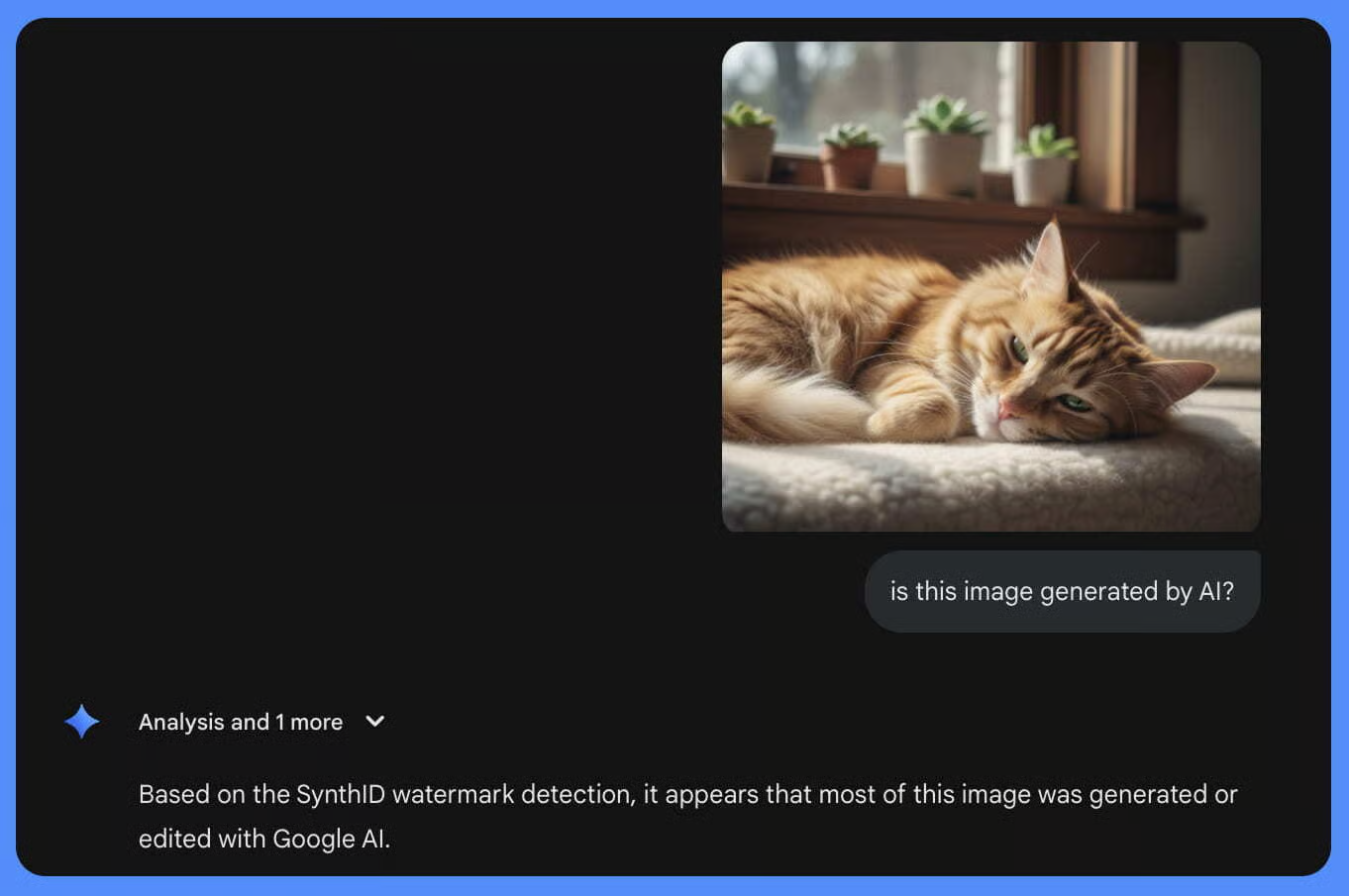 3️⃣ Check for SynthID Watermarks: Gemini looks for the SynthID watermark, which is used to help identify content generated or edited by Google AI tools. If SynthID is present, it strengthens the case that the image is AI-produced or AI-modified through Google’s ecosystem.